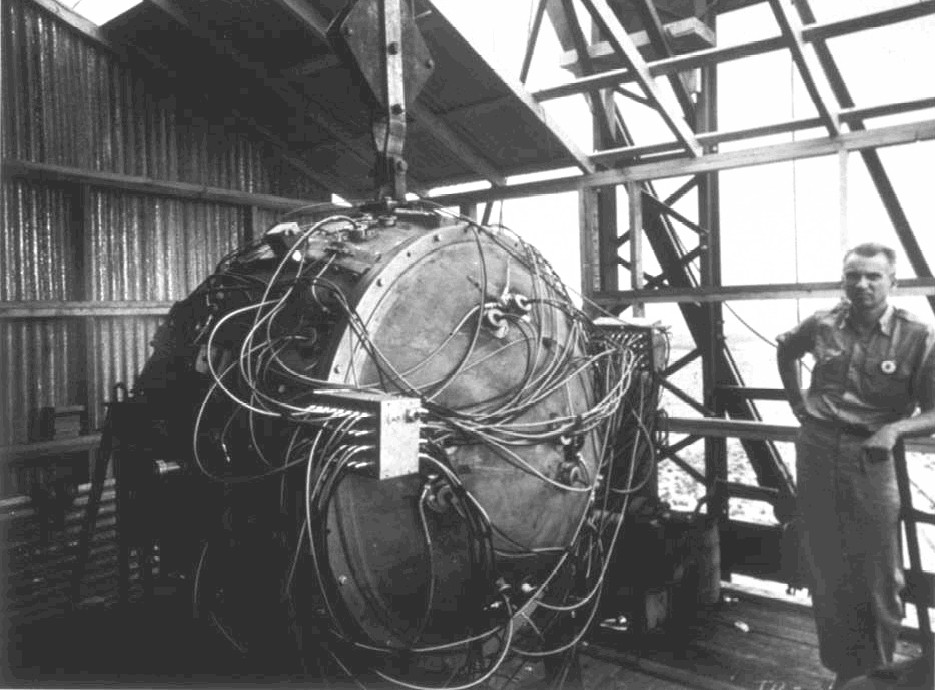 *Die teils zusammengebaute Trinity. Der Herr im zweiten Bild heißt Norris Bradbury. Er wurde mit der Aufsicht der Sprengung und den damit verbundenen Messungen betraut